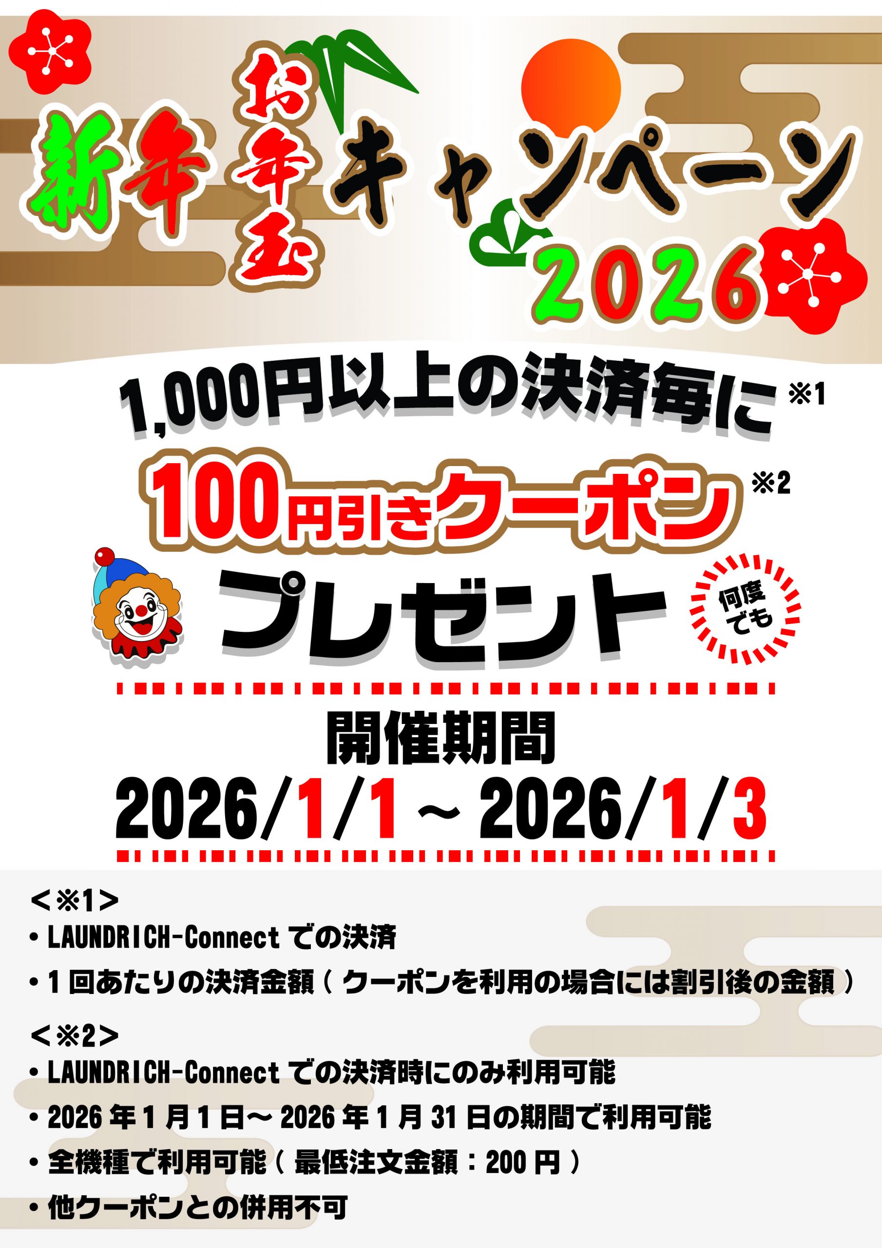 期間中にLAUNDRICH-Connectで1回あたり1,000円以上の決済をする度に100円引きクーポンをプレゼント!